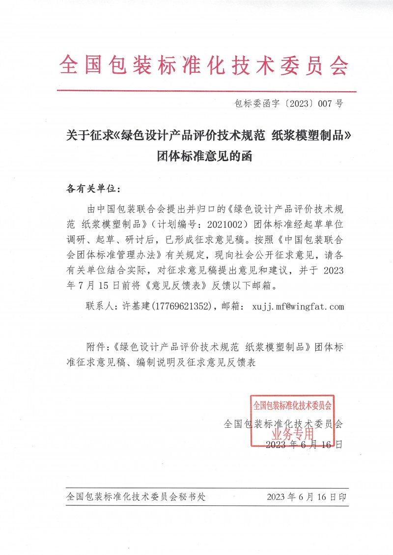 中國包裝聯合會關于征求《綠色設計產品評價技術規范 紙漿模塑制品》團體標準意見的函(包標委函字[2023]007號)