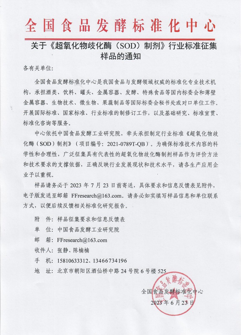 核心提示:全國(guó)食品發(fā)酵標(biāo)準(zhǔn)化中心關(guān)于《超氧化物歧化酶(SOD)制劑》行業(yè)標(biāo)準(zhǔn)征集樣品的通知,樣品請(qǐng)務(wù)必于2023年7月23日前寄送。