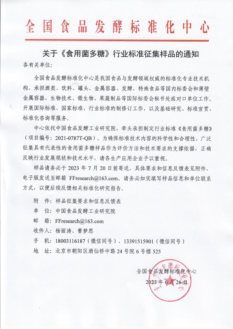 全國食品發(fā)酵標準化中心關(guān)于《食用菌多糖》行業(yè)標準征集樣品的通知