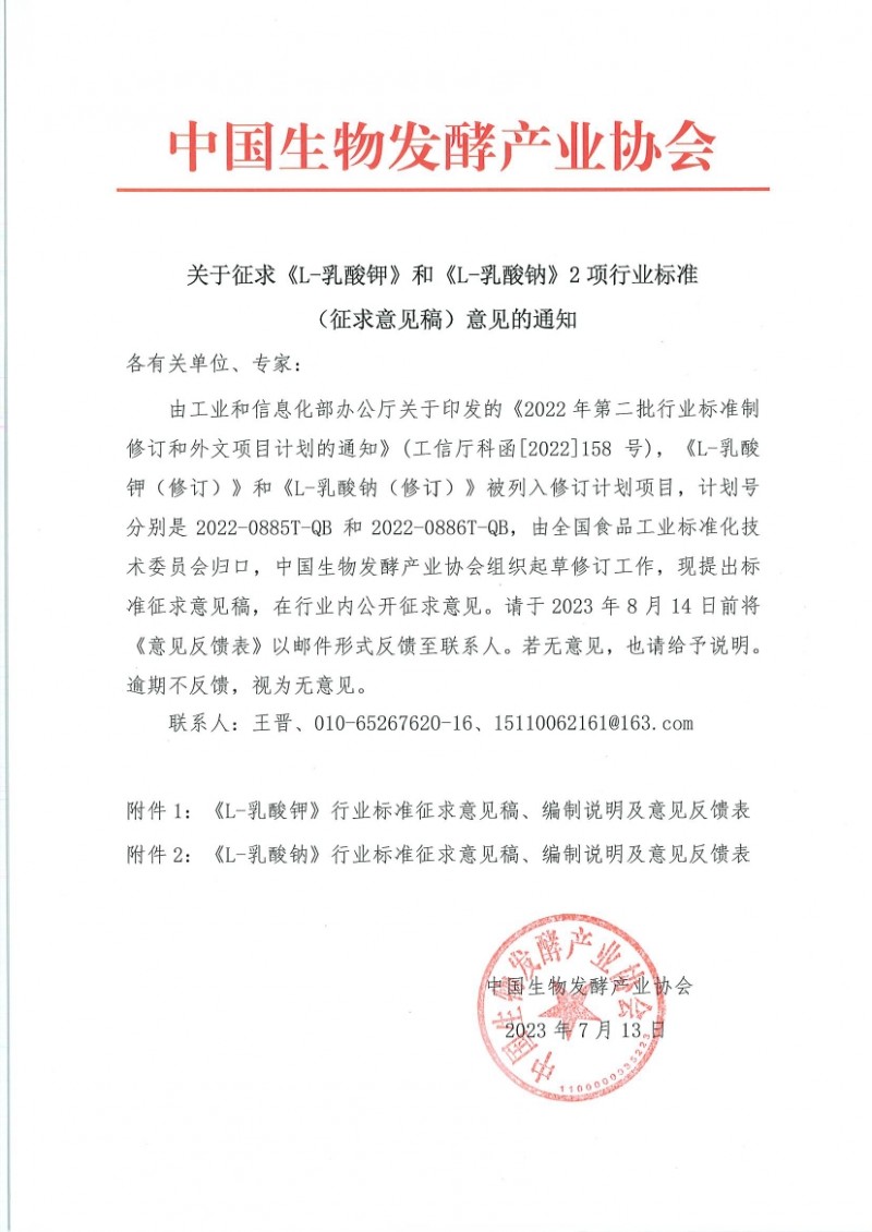核心提示:中國生物發酵產業協會關于征求《L-乳酸鉀》和《L-乳酸鈉》2項行業標準(征求意見稿)意見的通知,截止時間2023.8.14