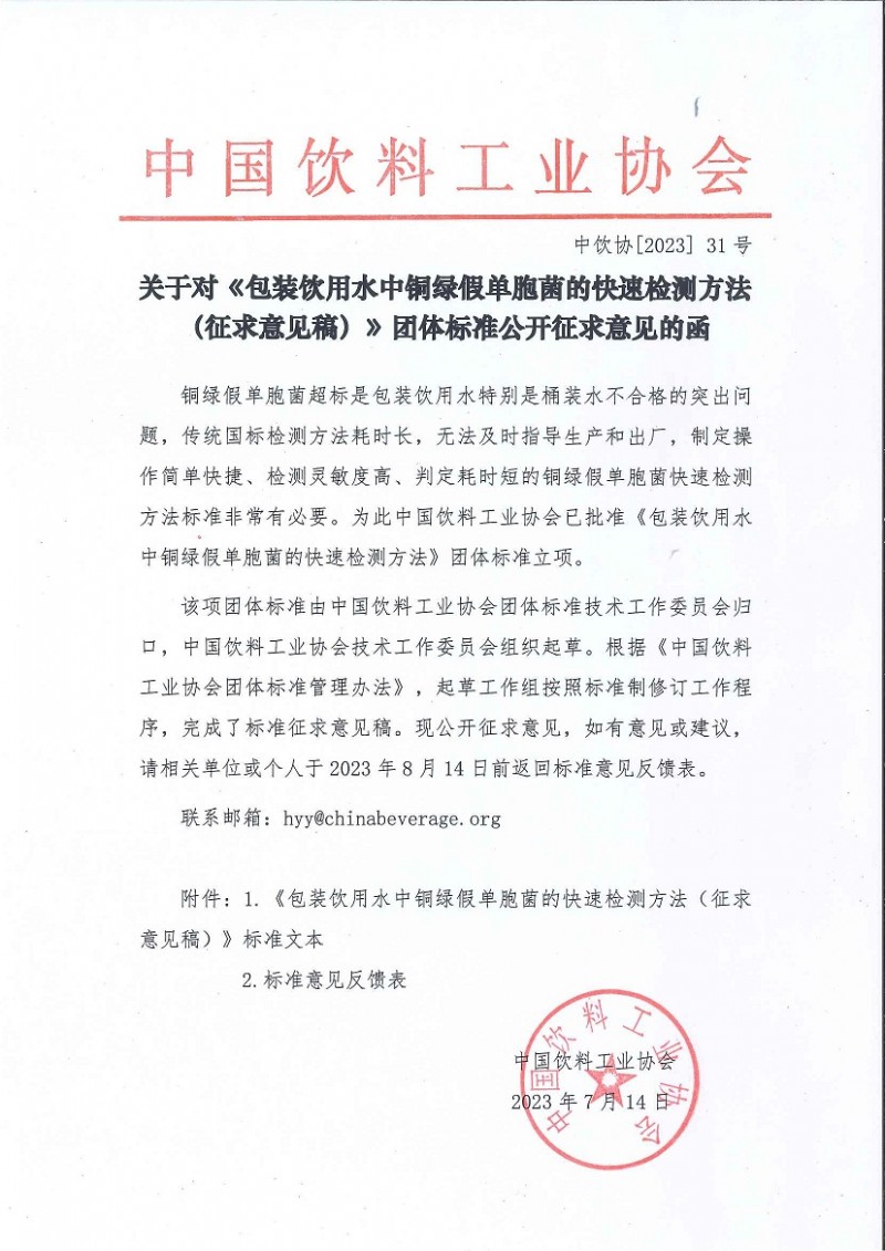 中國飲料工業(yè)協(xié)會關于對《包裝飲用水中銅綠假單胞菌的快速檢測方法(征求意見稿)》團體標準公開征求意見的函(中飲協(xié)[2023]31號)