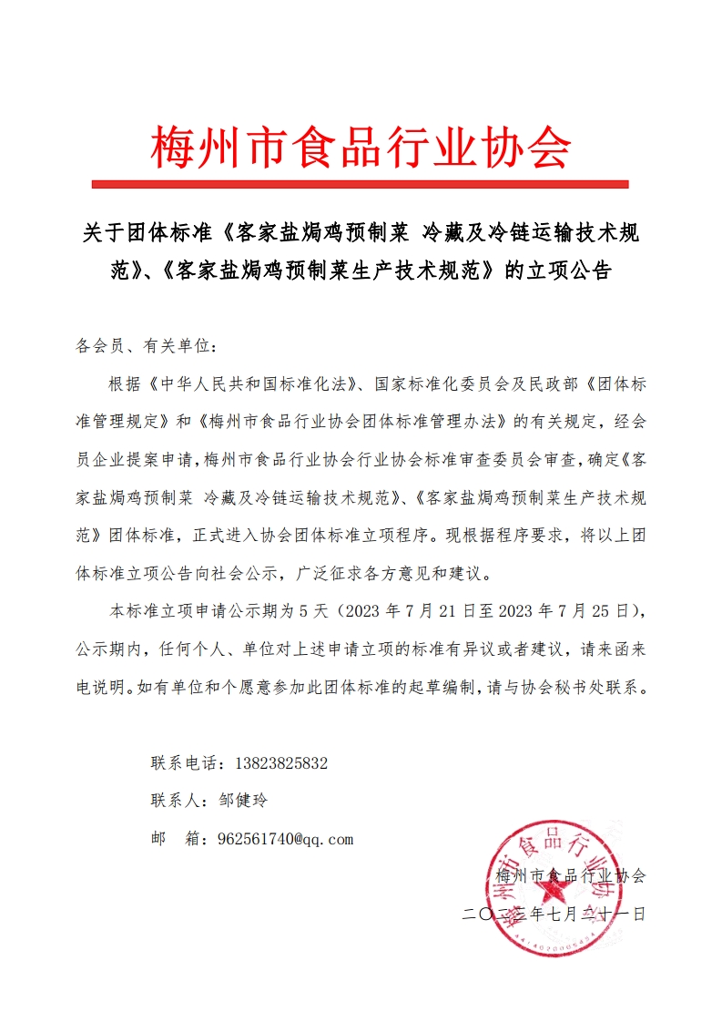 核心提示:梅州市食品行業協會關于團體標準《客家鹽焗雞預制菜 冷藏及冷鏈運輸技術規范》、《客家鹽焗雞預制菜生產技術規范》的立項公告