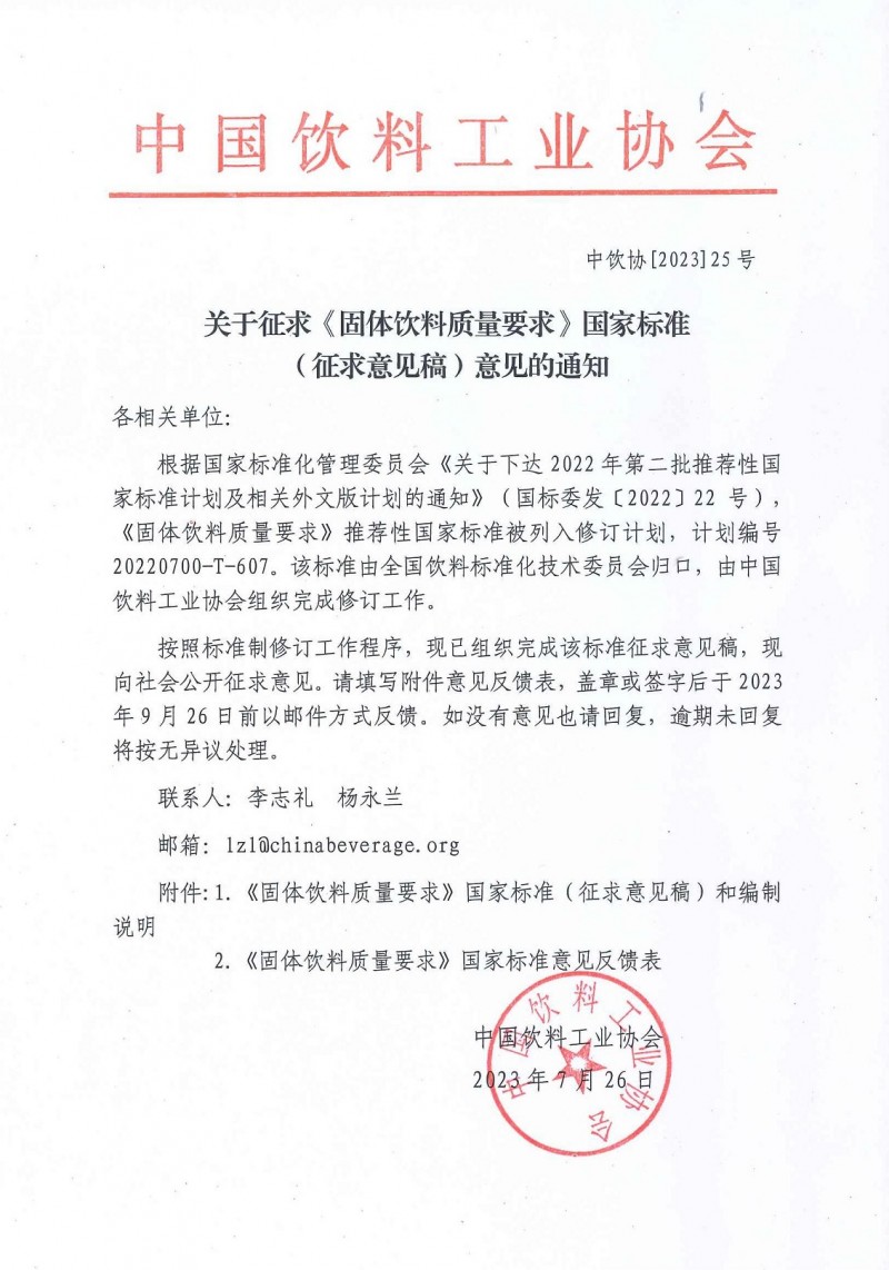 中國飲料工業協會關于征求《固體飲料質量要求》國家標準(征求意見稿)意見的通知