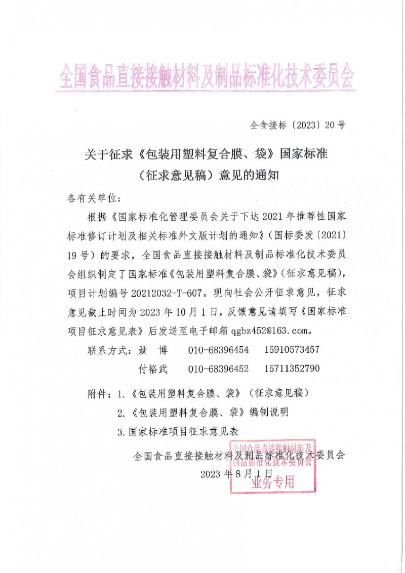 1、《包裝用塑料復合膜、袋》(征求意見稿)