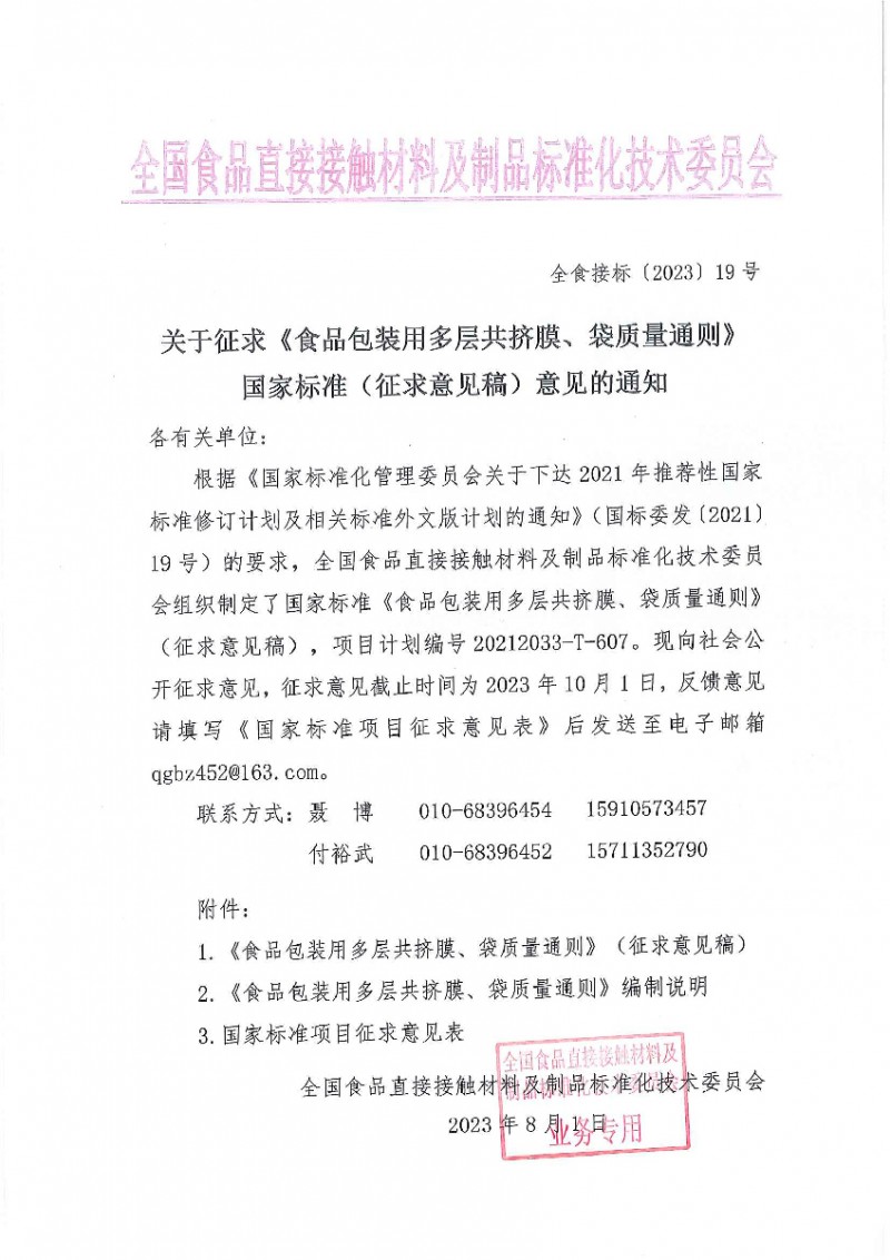 1、《食品包裝用多層共擠膜、袋質量通則》(征求意見稿)