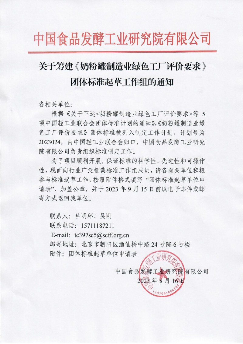核心提示:中國食品發(fā)酵工業(yè)研究院關于籌建《奶粉罐制造業(yè)綠色工廠評價要求》團體標準起草工作組的通知