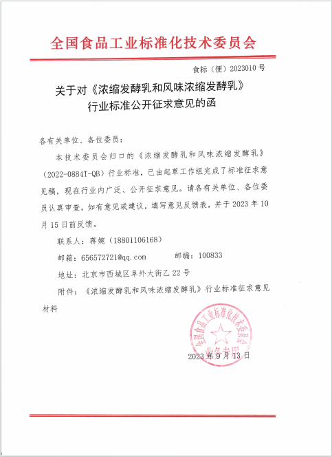 本技術委員會歸口的《濃縮發酵乳和風味濃縮發酵乳》(2022-0884T-QB)行業標準,已由起草工作組完成了標準征求意見稿,現在行業內廣泛、公開征求意見。請各有關單位、各位委員認真審查,如有意見或建議,填寫意見反饋表,并于2023年10月15日前反饋。