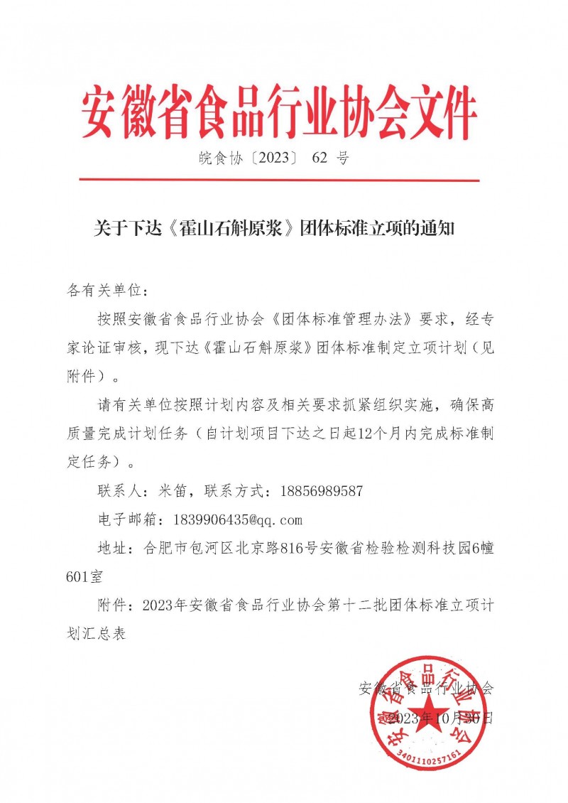 安徽省食品行業(yè)協(xié)會關(guān)于下達《霍山石斛原漿》團體標(biāo)準(zhǔn)立項的通知