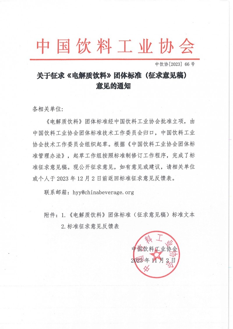 中國飲料工業協會關于征求《電解質飲料》團體標準(征求意見稿)意見的通知(中飲協[2023]66號)