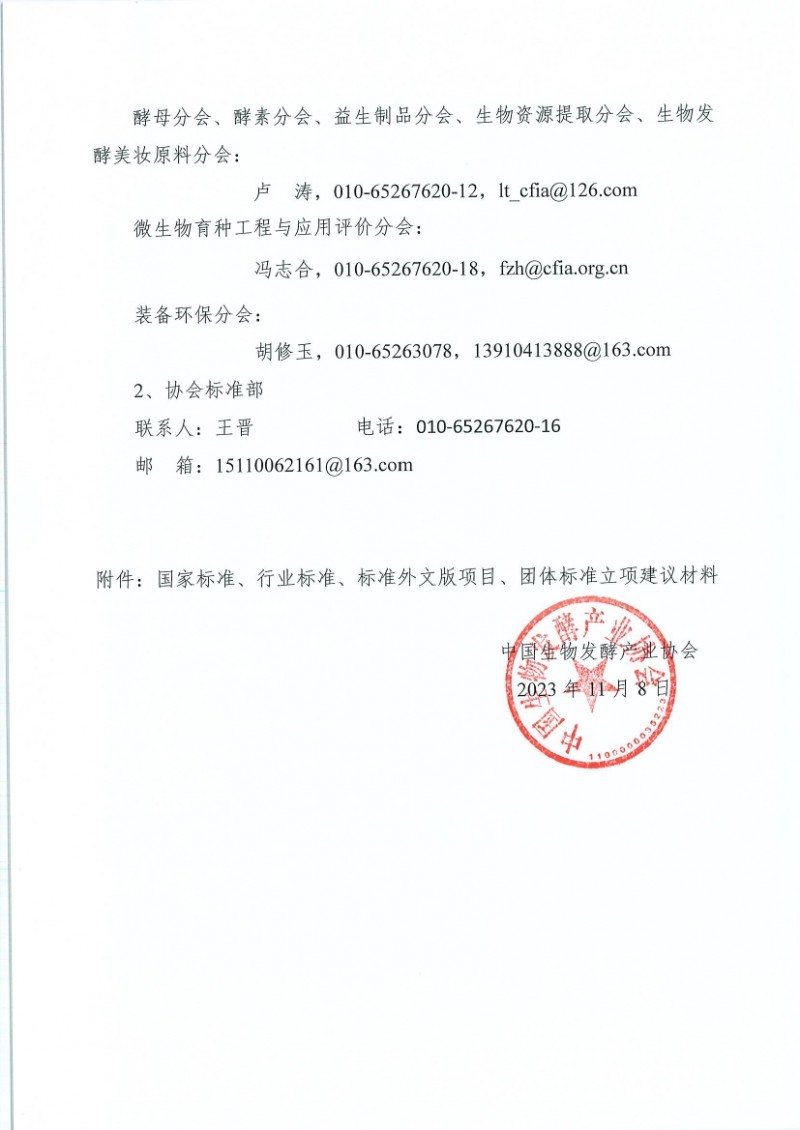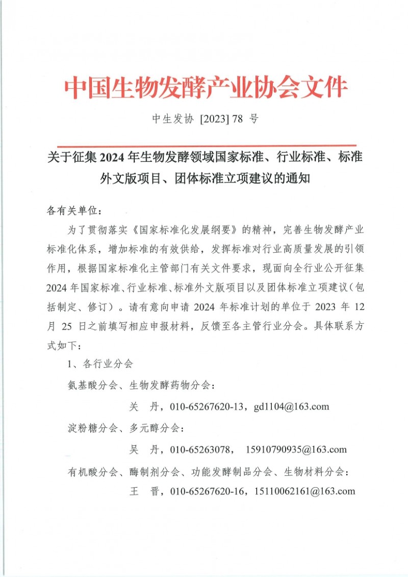 中國生物發酵產業協會關于征集2024年生物發酵領域國家標準、行業標準、標準外文版項目、團體標準立項建議的通知