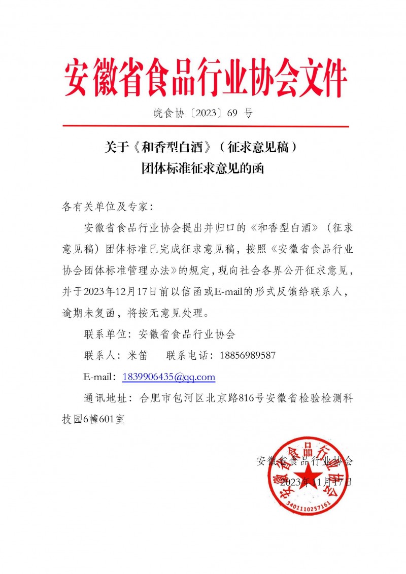 安徽省食品行業協會關于《和香型白酒》(征求意見稿)團體標準征求意見的函(皖食協〔2023〕69號)