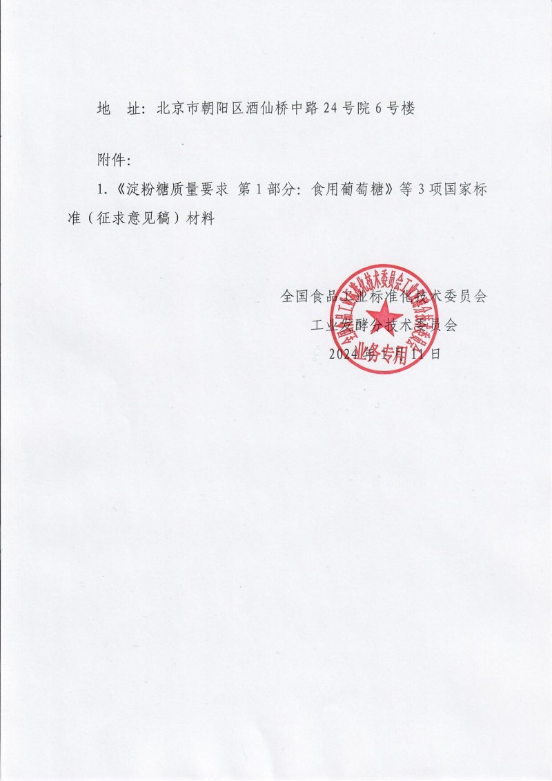 全國食品工業標準化技術委員會工業發酵分技術委員會關于征求《淀粉糖質量要求 第1部分:食用葡萄糖》等3項國家標準(征求意見稿)意見的通知(工業發酵分標委〔2024〕2號)