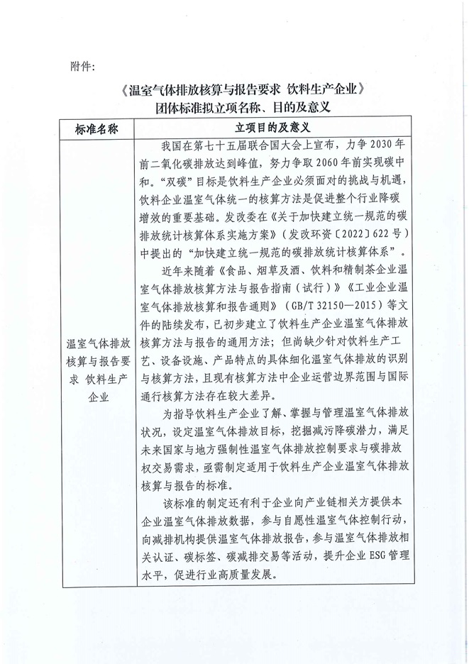 中國飲料工業協會關于《溫室氣體排放核算與報告要求 飲料生產企業》團體標準立項計劃征求意見的通知
