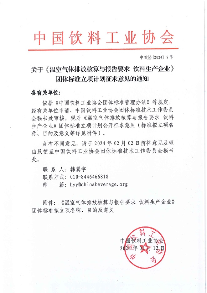 中國飲料工業協會關于《溫室氣體排放核算與報告要求 飲料生產企業》團體標準立項計劃征求意見的通知(中飲協[2024]9號)