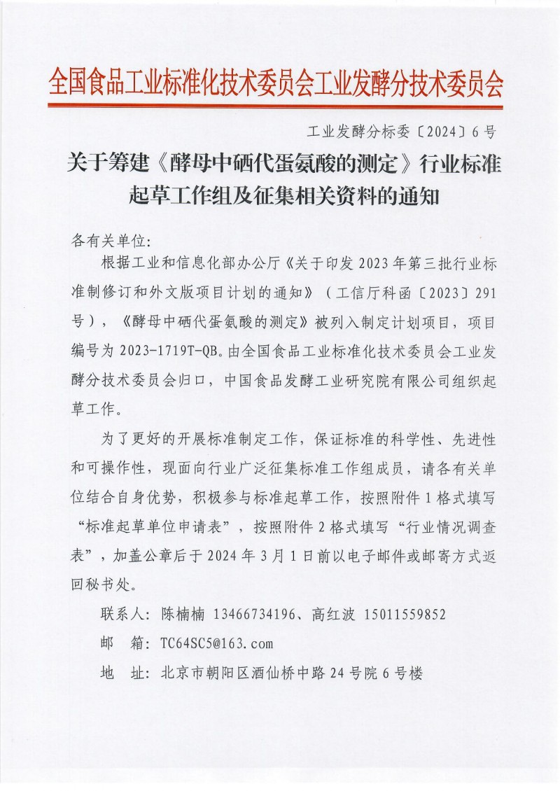 核心提示:全國食品工業標準化技術委員會工業發酵分技術委員會關于籌建《酵母中硒代蛋氨酸的測定》行業標準起草工作組及征集相關資料的通知,截止時間2024.3.1
