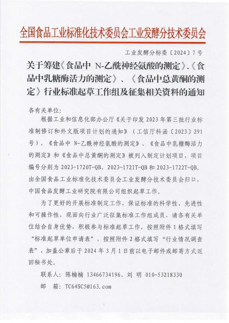 核心提示:全國食品工業標準化技術委員會工業發酵分技術委員會關于籌建《食品中 N-乙酰神經氨酸的測定》、《食品中乳糖酶活力的測定》、《食品中總黃酮的測定》行業標準起草工作組及征集相關資料的通知,截止時間2024.3.1