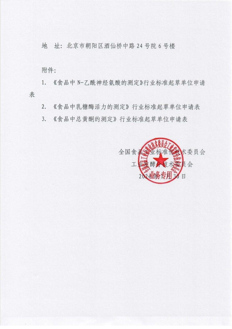 全國食品工業標準化技術委員會工業發酵分技術委員會關于籌建《食品中 N-乙酰神經氨酸的測定》、《食品中乳糖酶活力的測定》、《食品中總黃酮的測定》行業標準起草工作組及征集相關資料的通知