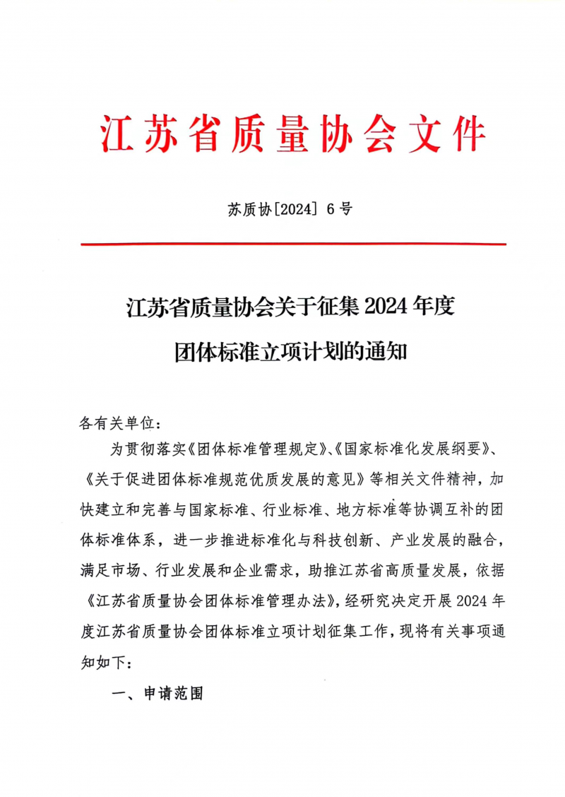 江蘇省質量協會關于征集2024年度團體標準立項計劃的通知