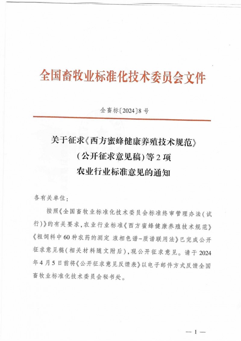 下載中心首頁 » 動態公告 » 標準動態 » 全國畜牧總站關于征求《西方蜂蜜健康養殖技術規范》(公開征求意見稿)等2項農業行業標準意見的通知(全畜標[2024]8號)