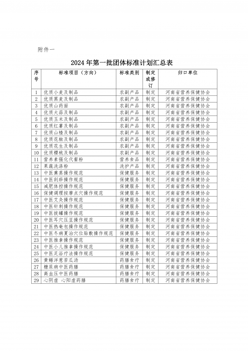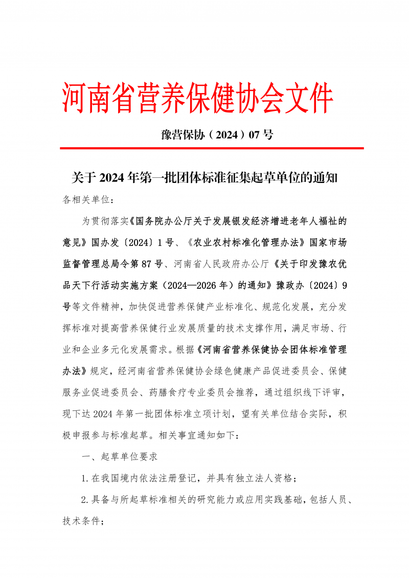 為貫徹落實國務院辦公廳《關于發展銀發經濟增進老年人福祉的意見》國辦發〔2024〕1號、《農業農村標準化管理辦法》國家市場監督管理總局令第87號、河南省人民政府辦公廳《關于印發豫農優品天下行活動實施方案(2024—2026年)的通知》豫政辦〔2024〕9號等文件精神,加快促進營養保健產業標準化、規范化發展,充分發揮標準對提高營養保健行業發展質量的技術支撐作用,滿足市場、行業和企業多元化發展需求。根據《河南省營養保健協會團體標準管理辦法》規定,經河南省營養保健協會綠色健康產品促進委員會、保健服務業促進委員會、藥膳食療專業委員會推薦,通過組織線下評審,現下達2024年第一批團體標準立項計劃,望有關單位結合實際,積極申報參與標準起草。相關事宜通知如下:
