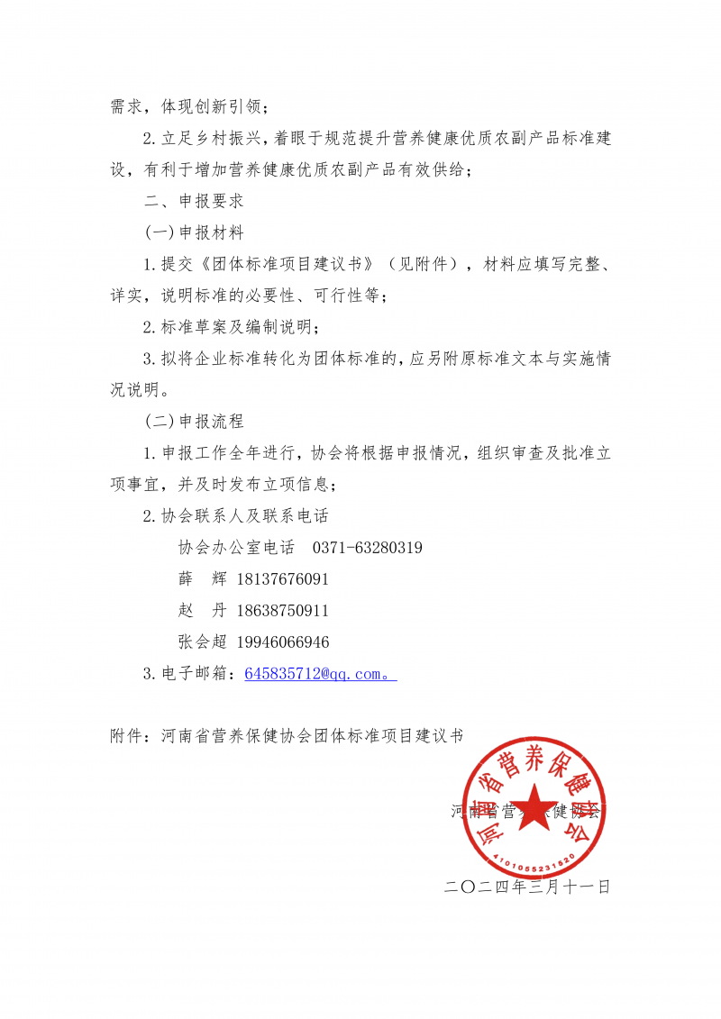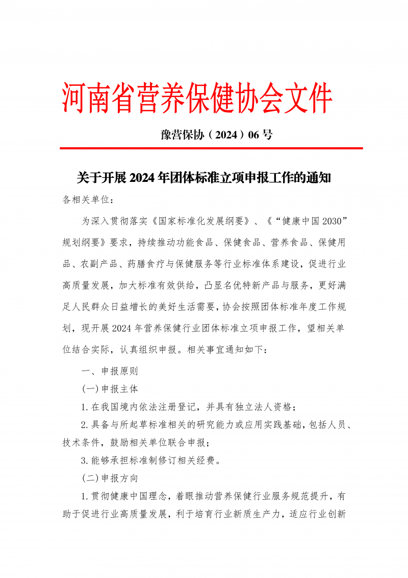 為深入貫徹落實《國家標準化發展綱要》、《“健康中國2030”規劃綱要》要求,持續推動功能食品、保健食品、營養食品、保健用品、農副產品、藥膳食療與保健服務等行業標準體系建設,促進行業高質量發展,加大標準有效供給,凸顯名優特新產品與服務,更好滿足人民群眾日益增長的美好生活需要,協會按照團體標準年度工作規劃,現開展2024年營養保健行業團體標準立項申報工作,望相關單位結合實際,認真組織申報。相關事宜通知如下: