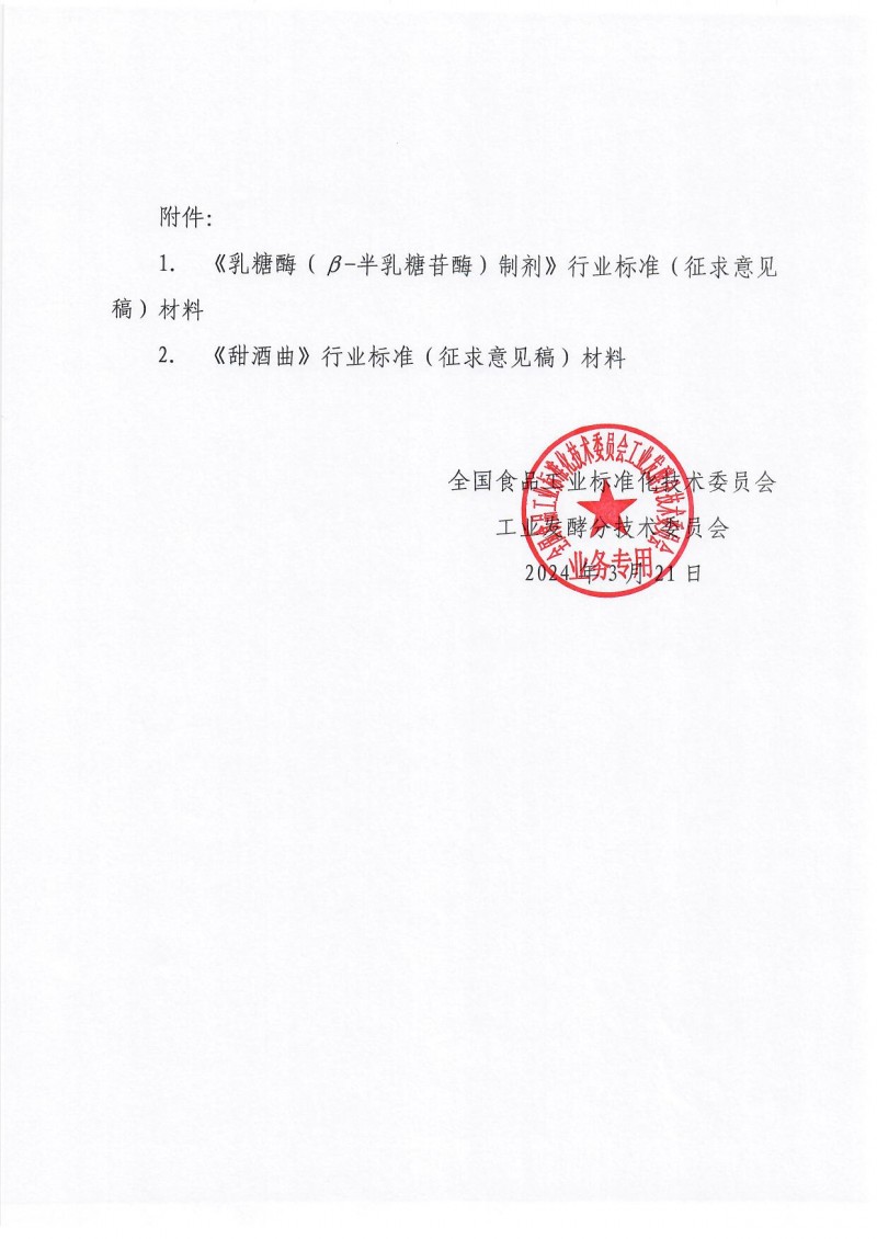 全國食品工業標準化技術委員會工業發酵分技術委員會關于征求《乳糖酶(β-半乳糖苷酶)制劑》和《甜酒曲》2項行業標準(征求意見稿)意見的通知(工業發酵分標委[2024]10號)