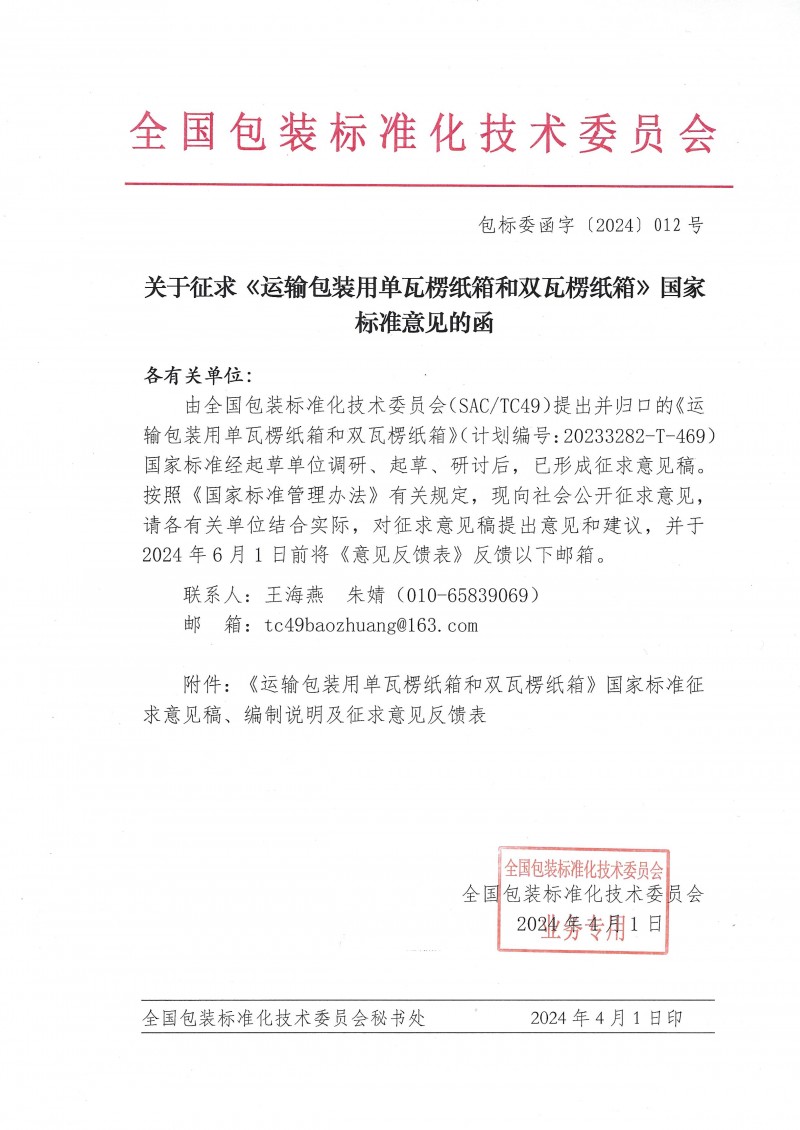 核心提示:全國包裝標準化技術委員會關于征求《運輸包裝用單瓦楞紙箱和雙瓦楞紙箱》國家標準意見的函,截止時間2024.6.1