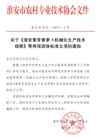 根據(jù)《淮安市農(nóng)村專業(yè)技術(shù)協(xié)會(huì)團(tuán)體標(biāo)準(zhǔn)制修訂工作程序》的有關(guān)規(guī)定,淮安市蔬菜科學(xué)研究所等單位申報(bào)的《淮安紫芽青蘿卜機(jī)械化生產(chǎn)技術(shù)規(guī)程》、淮陰工學(xué)院等單位申報(bào)的《淮安芡實(shí)綠色生產(chǎn)技術(shù)規(guī)程》符合團(tuán)體標(biāo)準(zhǔn)立項(xiàng)條件,現(xiàn)準(zhǔn)予立項(xiàng)。