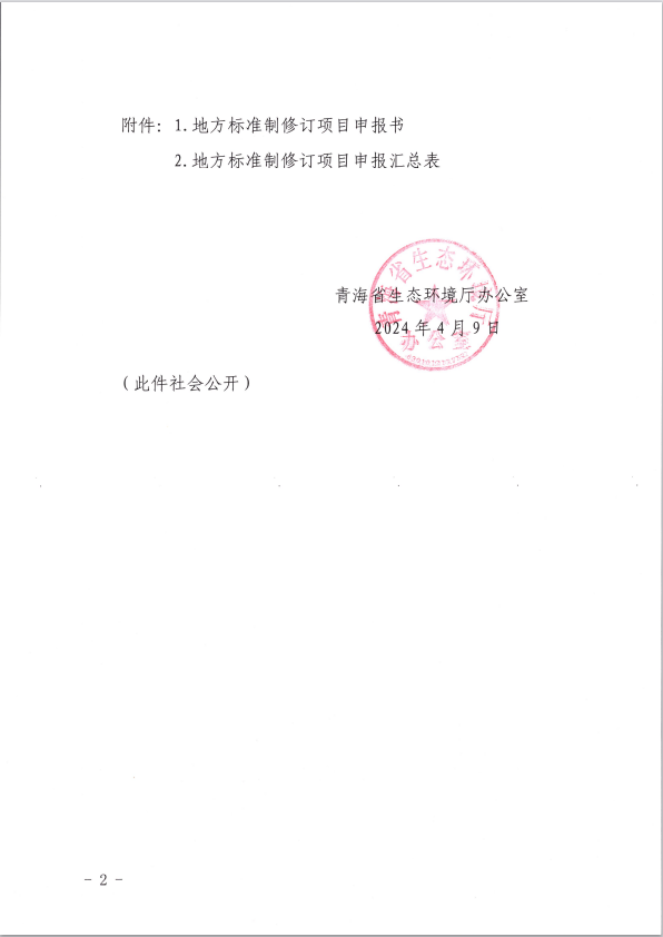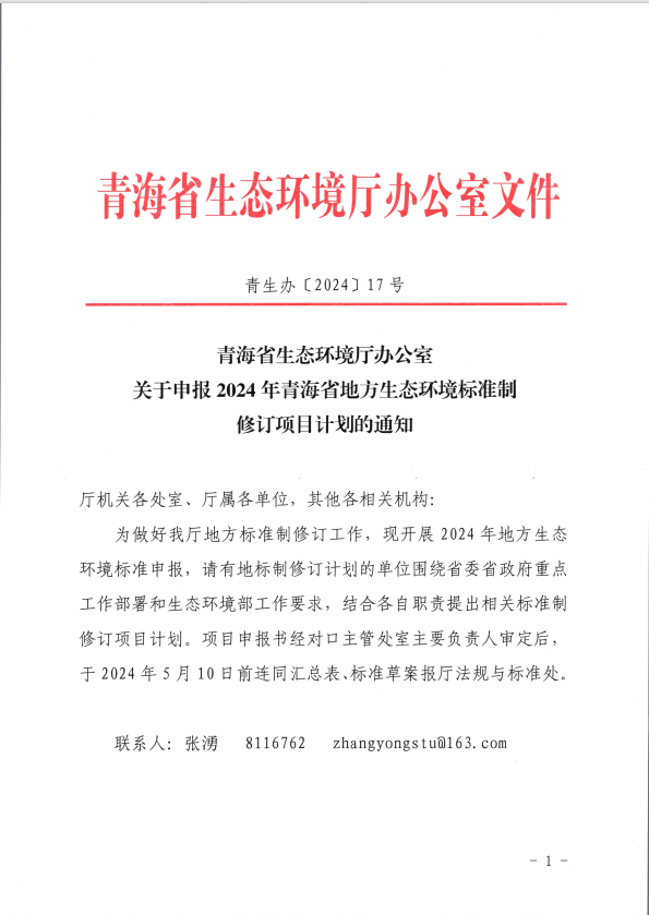 青海省生態環境廳關于申報2024年青海省地方生態環境標準制修訂項目計劃的通知(青生辦[2024]17號)