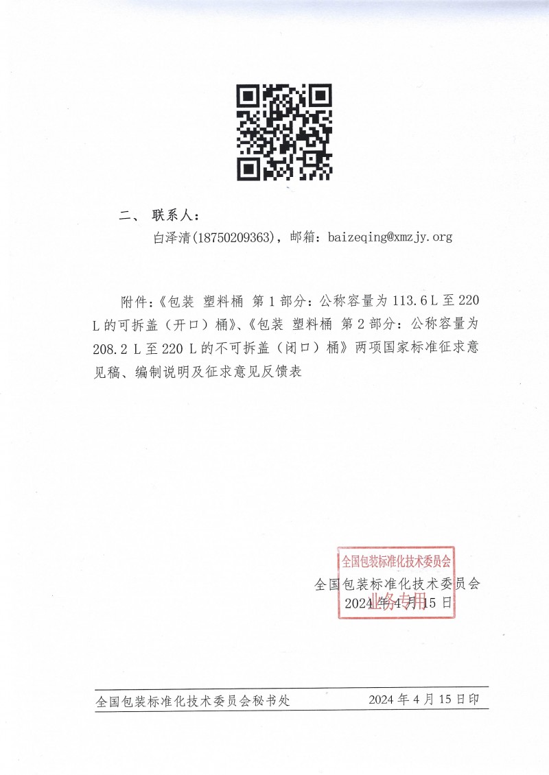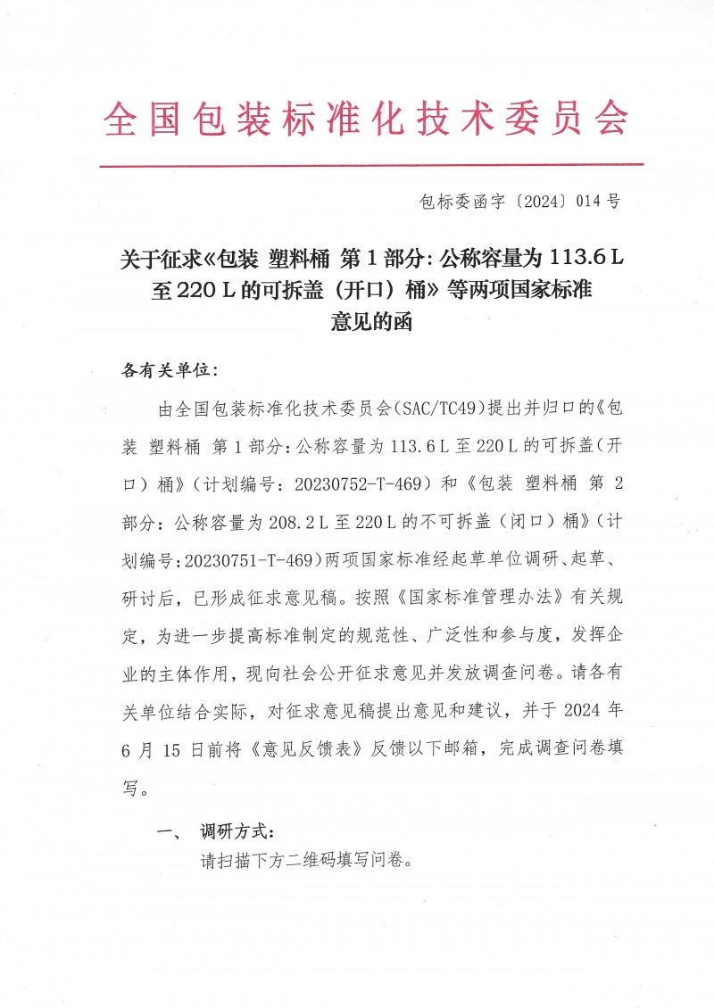 《包裝塑料桶第1部分:公稱容量為113.6L至220L的可拆蓋(開口)桶》國家標準(征求意見稿)