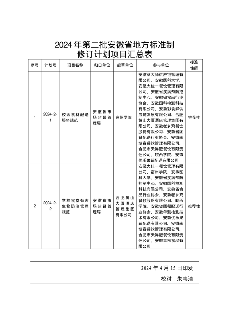 核心提示:安徽省市場監督管理局關于下達2024年第二批《校園食材配送服務規范》等安徽省地方標準制修訂計劃的通知(皖市監函〔2024〕163號)
