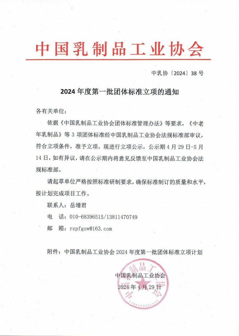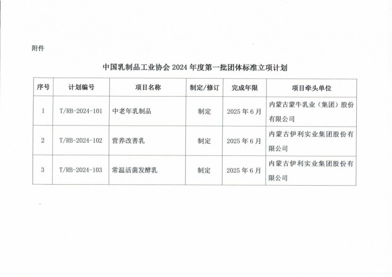中國乳制品工業協會發布2024年度第一批團體標準立項的通知(中乳協[2024]38號)