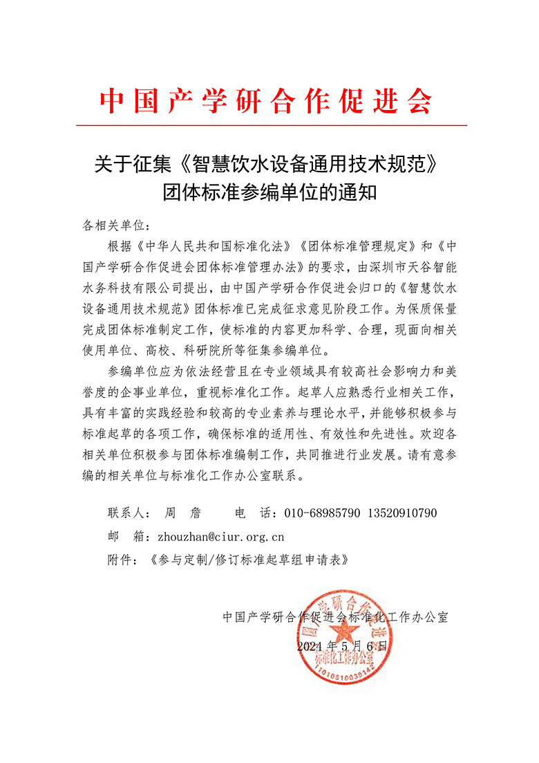 中國產學研合作促進會關于征集《智慧飲水設備通用技術規范》 團體標準參編單位的通知