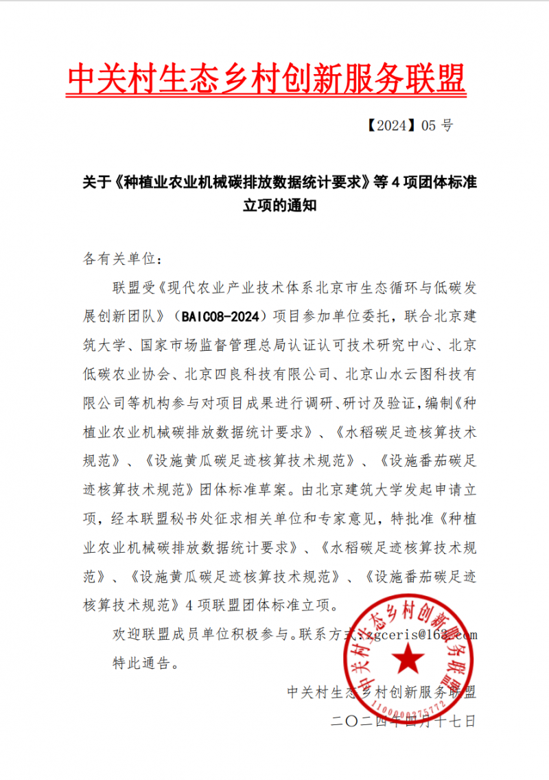 中關村生態鄉村創新服務聯盟關于《水稻碳足跡核算技術規范》等4項團體標準立項的通知(【2024】05號)