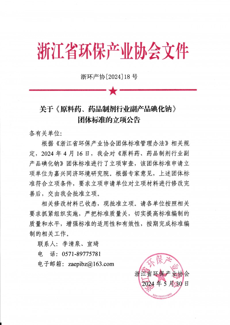 浙江省環(huán)保產(chǎn)業(yè)協(xié)會關(guān)于《原料藥、藥品制劑行業(yè)副產(chǎn)品碘化鈉》團體標(biāo)準(zhǔn)的立項公告