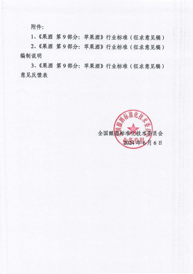 全國釀酒標準化技術委員會關于征求《果酒 第9部分:蘋果酒》行業標準(征求意見稿)意見的通知(釀酒標委[2024] 29號)