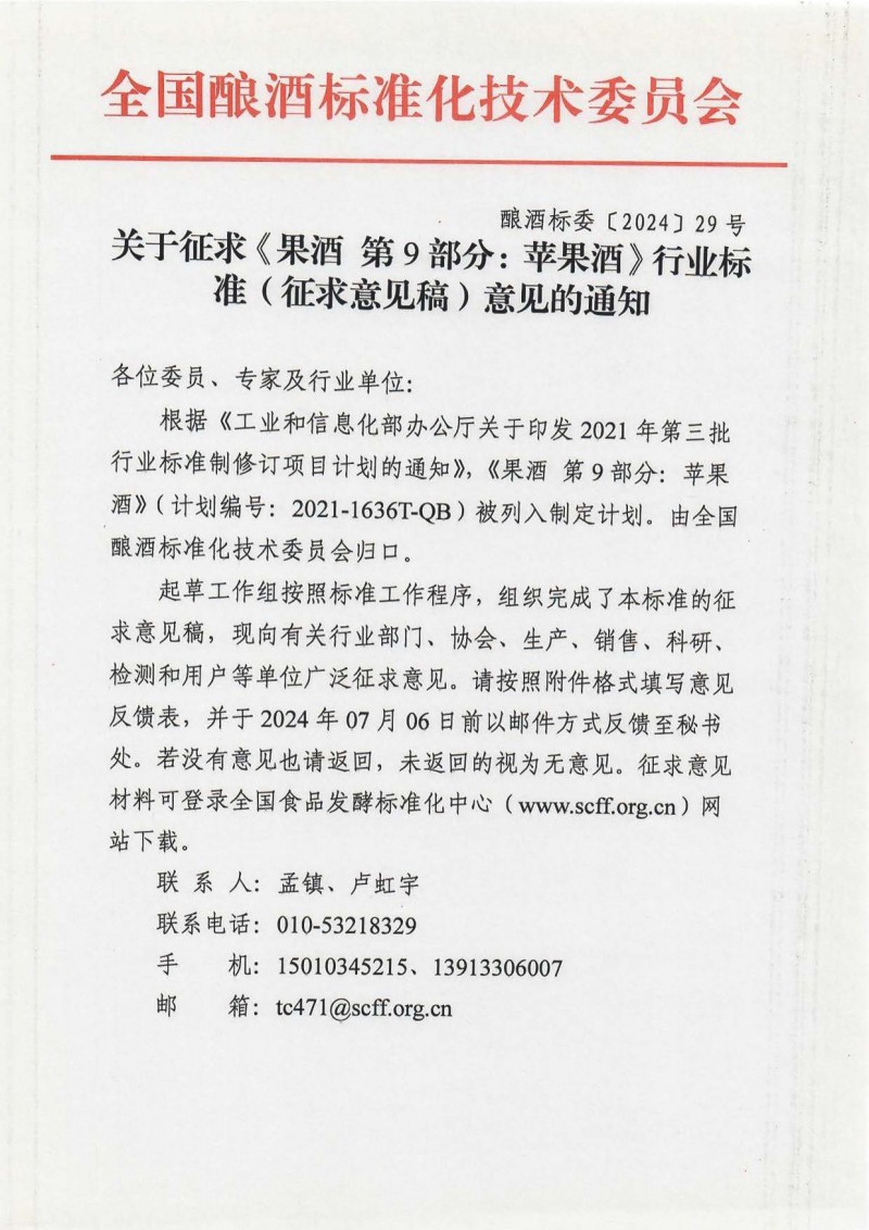 下載中心首頁 » 動態公告 » 標準動態 » 全國釀酒標準化技術委員會關于征求《果酒 第9部分:蘋果酒》行業標準(征求意見稿)意見的通知(釀酒標委[2024] 29號)