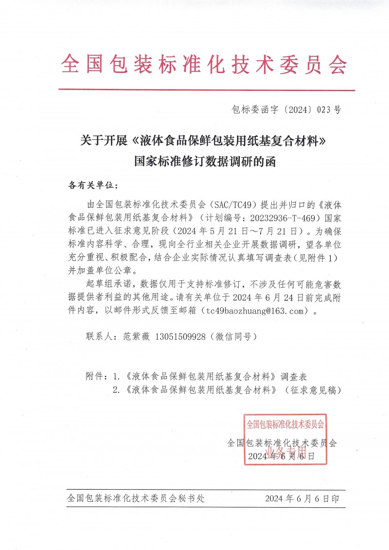 全國包裝標(biāo)準(zhǔn)化技術(shù)委員會關(guān)于開展《液體食品保鮮包裝用紙基復(fù)合材料》國家標(biāo)準(zhǔn)修訂數(shù)據(jù)調(diào)研的函(包標(biāo)委函字〔2024〕023號)