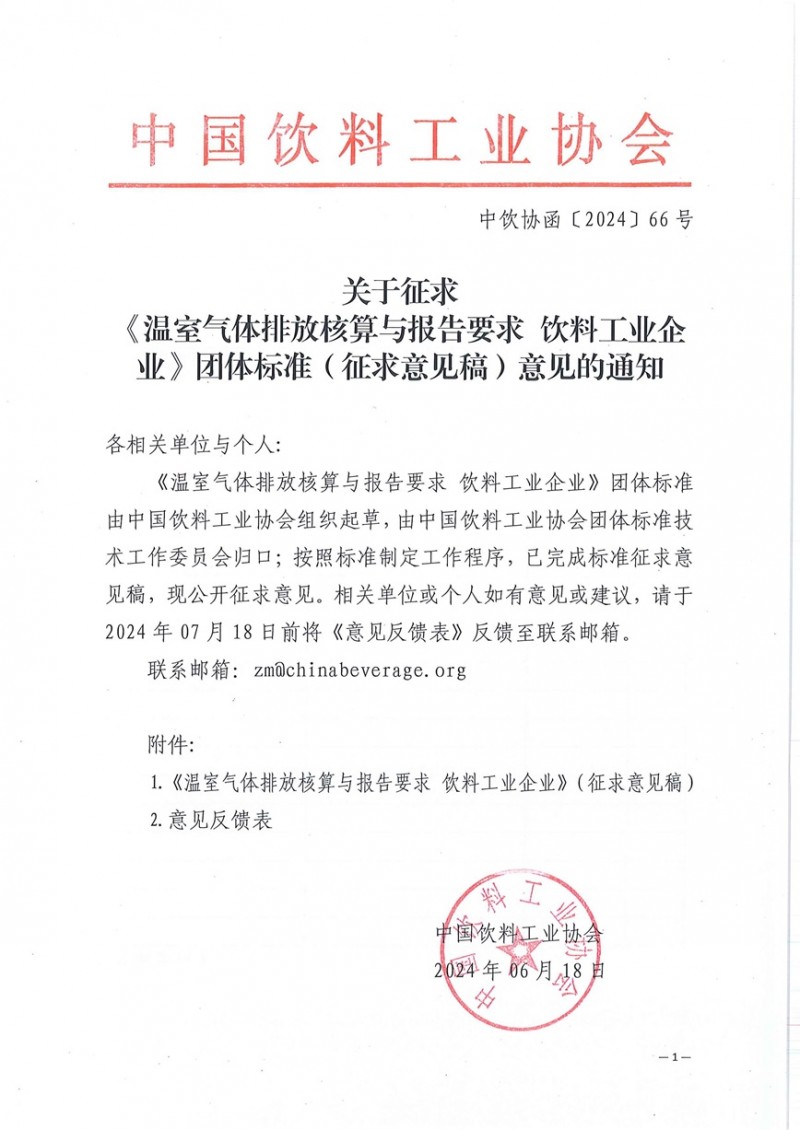 中國飲料工業協會關于征求《溫室氣體排放核算與報告要求 飲料工業企業》團體標準(征求意見稿)意見的通知(中飲協函[2024]66號)