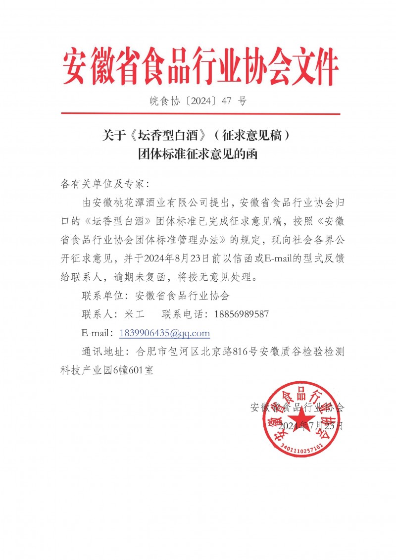 安徽省食品行業協會關于《壇香型白酒》(征求意見稿) 團體標準征求意見的函(皖食協[2024]47號)