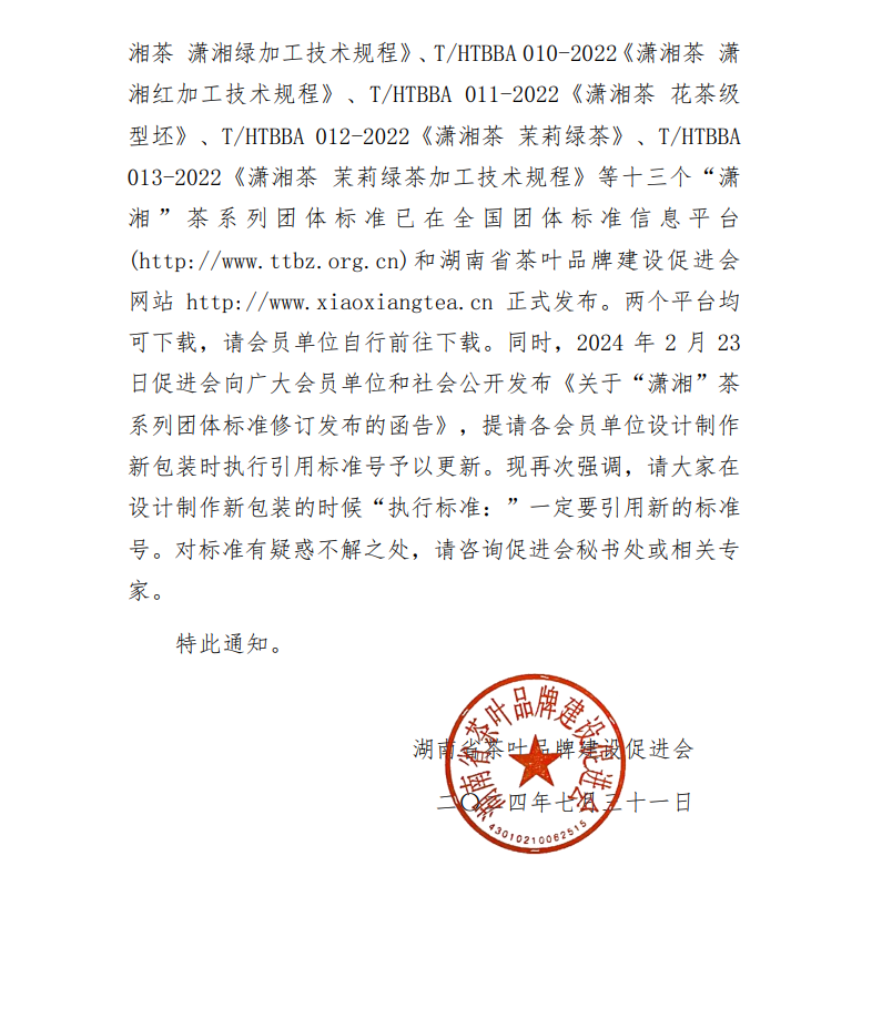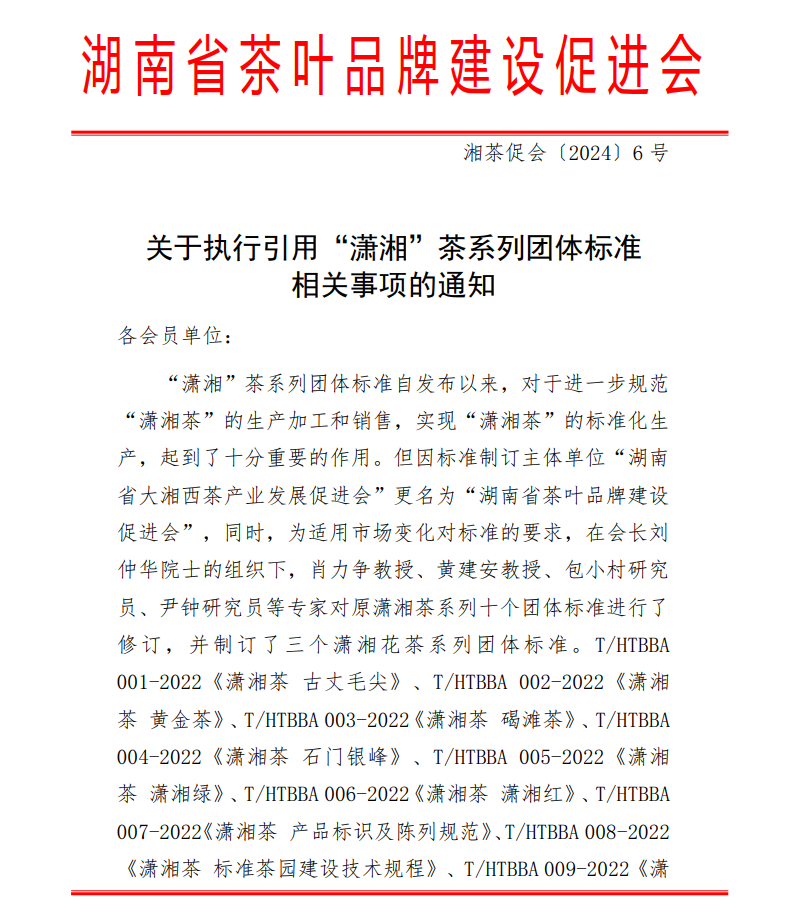湖南省茶葉品牌建設促進會關于執行引用“瀟湘”茶系列團體標準相關事項的通知(湘茶促會〔2024〕6號)