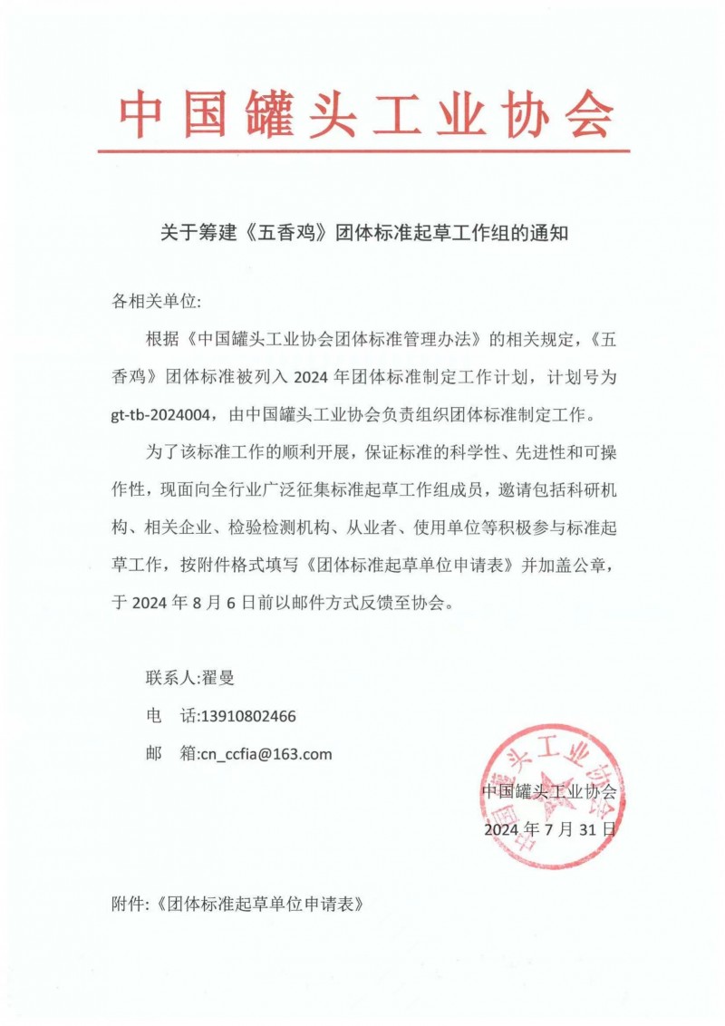 中國罐頭工業協會關于籌建《五香雞》團體標準起草工作組的通知