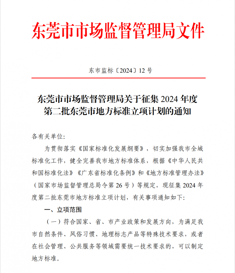 東市監標〔2024〕12號——東莞市市場監督管理局關于征集2024年度第二批東莞市地方標準立項計劃的通知.pdf