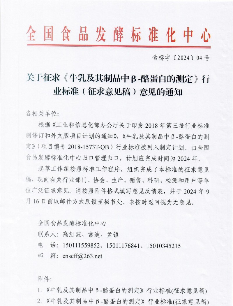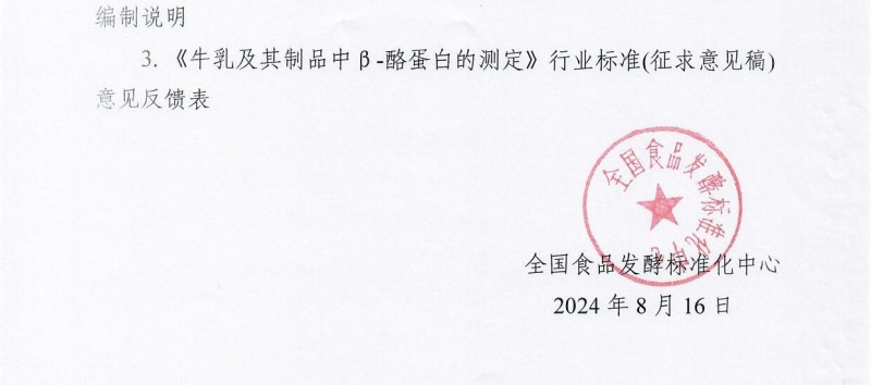 全國食品發酵標準化中心關于征求《牛乳及其制品中β-酪蛋白的測定》行業標準(征求意見稿)意見的通知