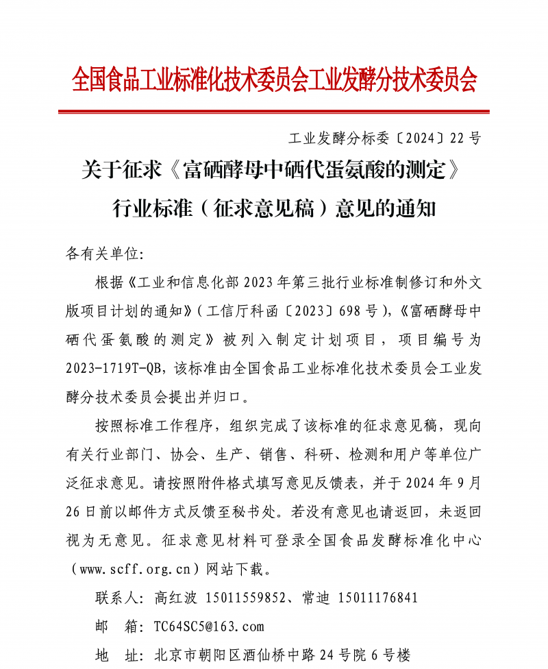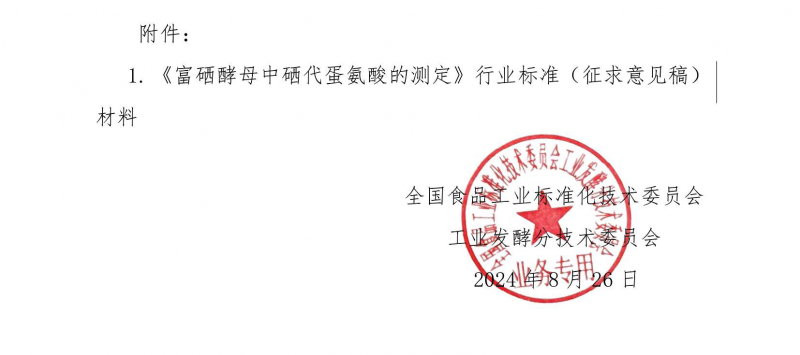 核心提示:國食品工業標準化技術委員會工業發酵分技術委員發布會關于征求《富硒酵母中硒代蛋氨酸的測定》行業標準(征求意見稿)意見的通知,征求意見時間截止到2024年9月26日。