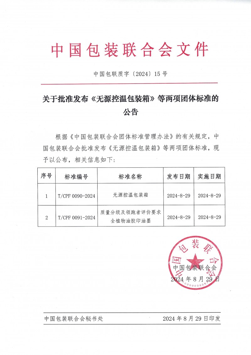 中國包裝聯合會關于批準發布《無源控溫包裝箱》等兩項團體標準的公告(中國包聯質字[2024]15號)
