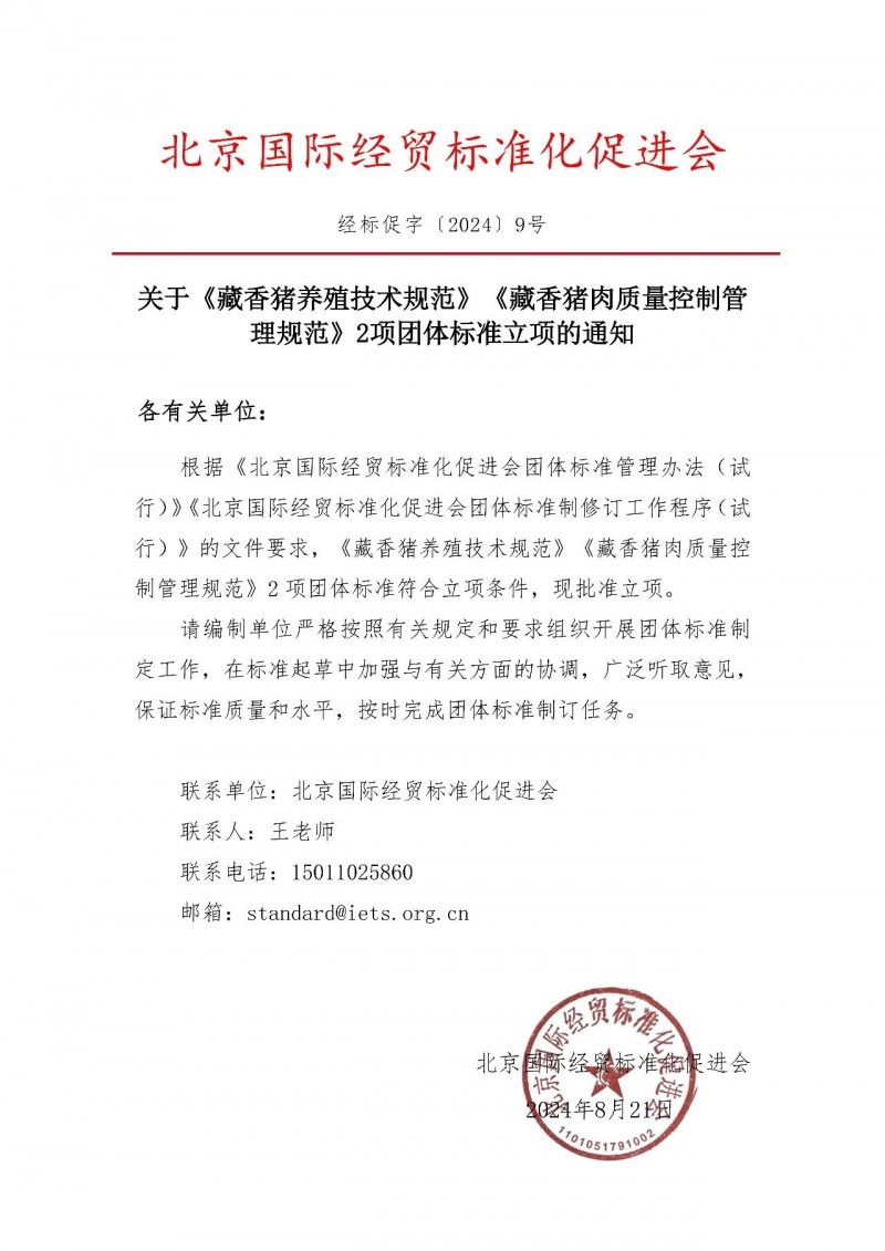 北京國際經貿標準化促進會關于《藏香豬養殖技術規范》《藏香豬肉質量控制管理規范》2項團體標準立項的通知(經標促字[2024]9號)