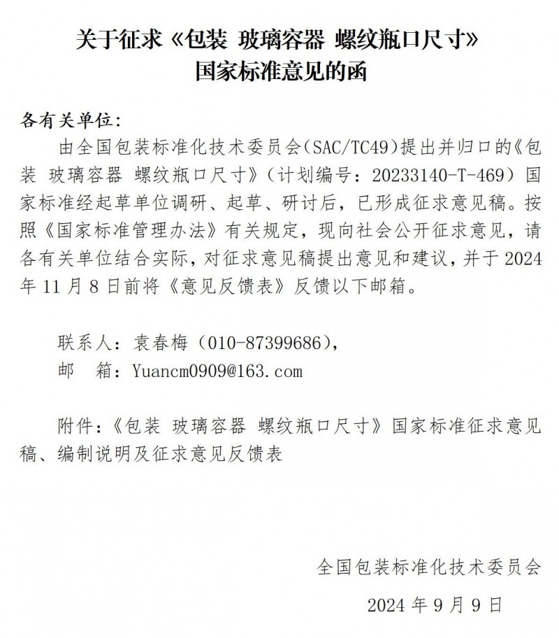 《包裝 玻璃容器 螺紋瓶口尺寸》國家標準(征求意見稿)意見反饋表