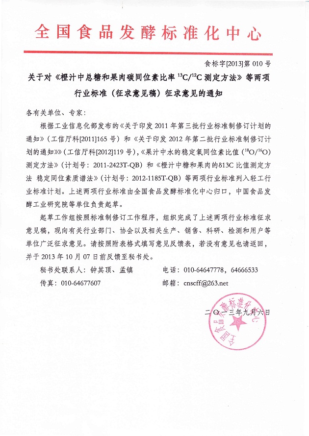 1、《橙汁中糖和果肉的碳同位素比率13C/12C測定方法》行業標準征求意見稿、編制說明、意見反饋表