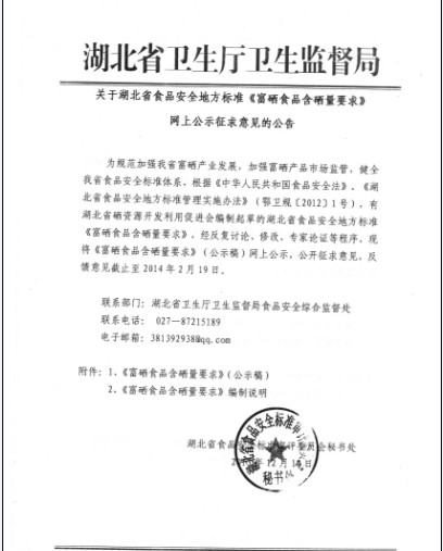 為規(guī)范加強(qiáng)我省富硒產(chǎn)業(yè)發(fā)展,加強(qiáng)富硒產(chǎn)品市場監(jiān)管,健全我省食品安全標(biāo)準(zhǔn)體系,根據(jù)《中華人民共和國食品安全法》、《湖北省食品安全地方標(biāo)準(zhǔn)管理實(shí)施辦法》(鄂衛(wèi)規(guī)[2012]1號(hào)),有湖北省硒資源開發(fā)利用促進(jìn)會(huì)編制起草的湖北省食品安全地方標(biāo)準(zhǔn)《富硒食品含硒量要求》,經(jīng)反復(fù)討論、修改,專家論證等程序,現(xiàn)將《富硒食品含硒量要求》(公示稿)網(wǎng)上公示,公開征求意見,反饋意見截止至2014年2月19日。